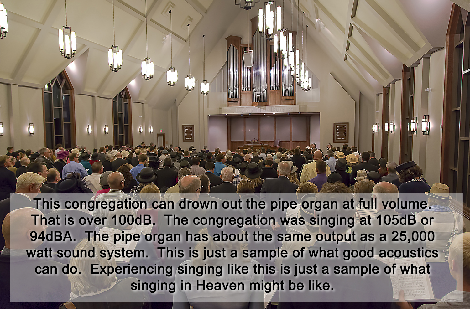 The organist of this church pulled every stop, pushed the peddles all the way down and the he had trouble hearing the organ just 20 feet away. At the back of the church at the sound booth, the organ was barely audible. I used a SPL meter, put it about 3 feet over my head at the back of the church and the congregational singing peaked at 105dB several time during a familiar hymn. There was no one behind us. There have been other times at other church where I designed or upgraded their acoustics were the congregation is singing acapella and they were peaking at 106dB. The good news is, singing like that doesn’t hurt your hearing.