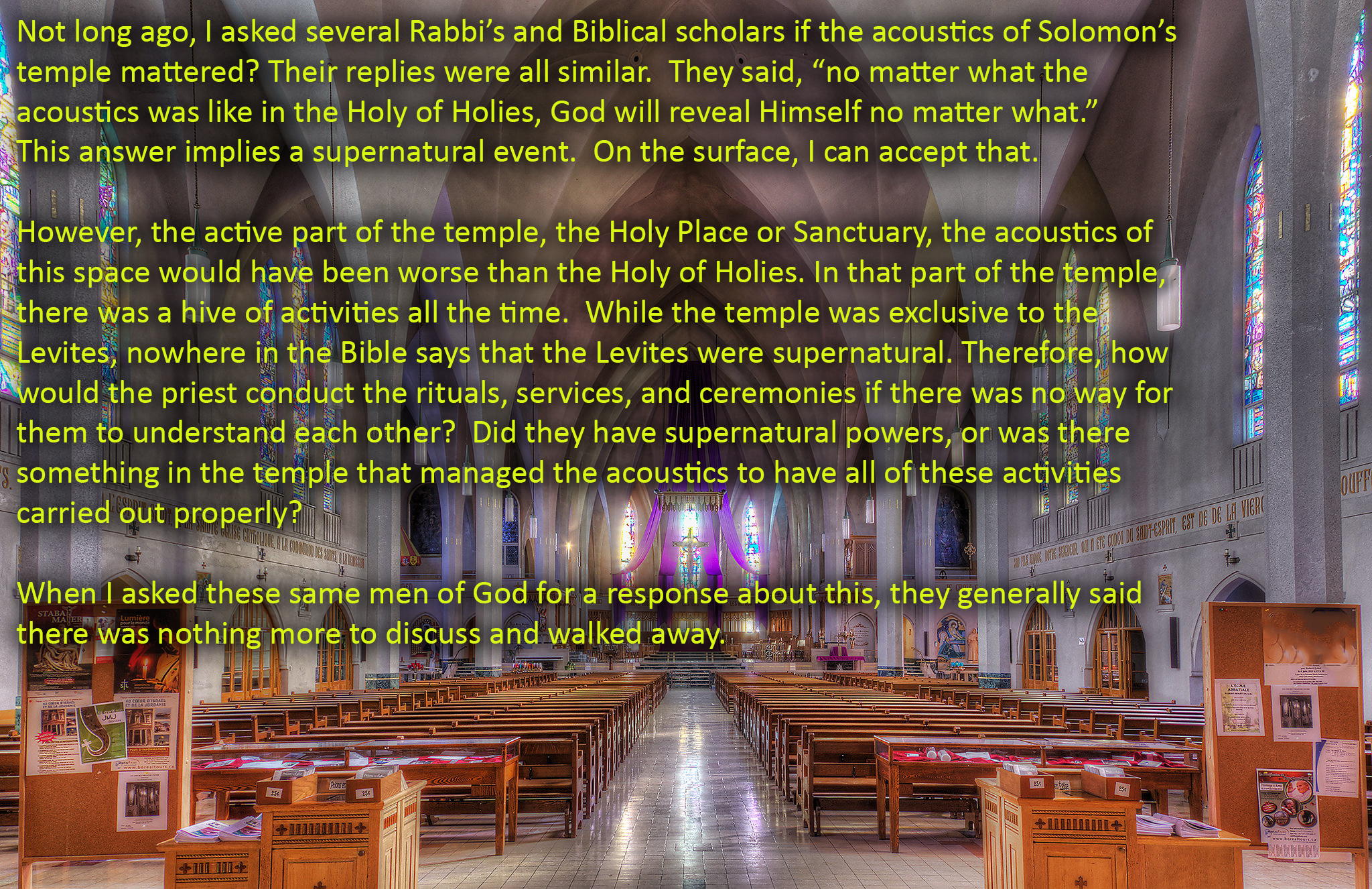 As an expert in Church Acoustics and in the pursuit of the truth, I have also been passionate about finding ways for all churches to afford an acoustical solution that will solve just about every sound problem most churches run into. What can be more exciting than knowing that the cheapest and best acoustical solution in the world for all churches comes from the book that all Christians follow and obey – the Bible. When a church uses the Bible’s method for acoustical management, sound problems almost all go away and in most cases, a sustained higher church attendance happens after around 18 months. God is the author of Church Acoustics and it is time for churches to seek God first for answers and God will reveal His way to solve sound problems in His Houses of Worship. Whenever a church is dedicated to God, doesn’t it become His House?