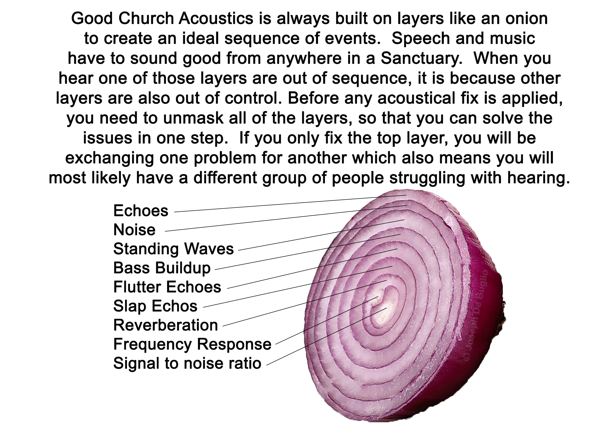 Sound systems cannot fix the acoustical problems of a church. Adding more speakers or applying the latest state of the art technology tricks are no match to Architectural failures in room design and unmanaged sound sequencing around a room. Absorptive panels are often the first weapon used to tame a room. Cutting down on the noise and reflections with absorption cannot fix deadspots or hotspots. Absorptive panels cannot change the path of sound reflections that causes uneven sound distribution. Absorptive panels have been known to make the sound harder to understand in those poor locations throughout the room, not better. What is needed is a different weapon to defeat poor sound.